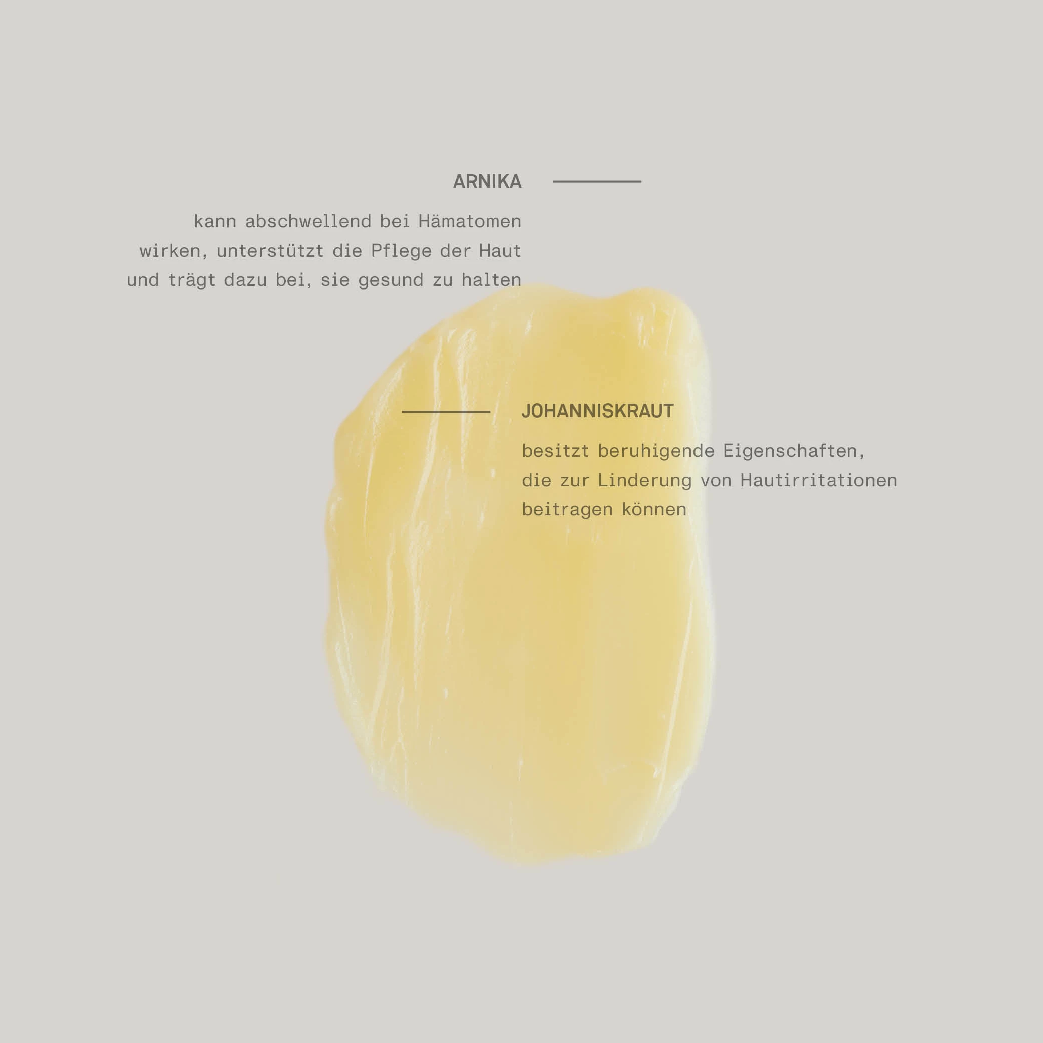 Soybean Glycerides, Helianthus Annuus (Sunflower) Seed Oil, Butyrospermum Parkii (Shea) Butter Unsaponifiables, Myrica Pubescens Fruit Wax, Ricinus Communis (Castor) Seed Oil, Hydrogenated Ethylhexyl Olivate, Helianthus Annuus (Sunflower) Seed Wax, Simmondsia Chinensis (Jojoba) Seed Oil*, Sesamum Indicum (Sesame) Seed Oil*, Pinene, Arnica Montana Extract*, Rhus Verniciflua Peel Wax, Hydrogenated Olive Oil Unsaponifiables, Pinus Sylvestris (Pine) Oil, Persea Gratissima (Avocado) Oil*, Rosa Canina Fruit Oil*, Hypericum Perforatum Flower / Leaf / Stem Extract*, Hippophae Rhamnoides (Seabuckthorn) Fruit Extract*, Rosmarinus Officinalis (Rosemary) Leaf Extract*, Rosmarinus Officinalis (Rosemary) Extract*, Lecithin, Tocopherol, Ascorbyl Palmitate, Citric Acid, Limonene, Beta-Caryophyllene, Terpineol, Terpinolene, Alpha-Terpinene, Camphor. *ingredients from certified organic agriculture.