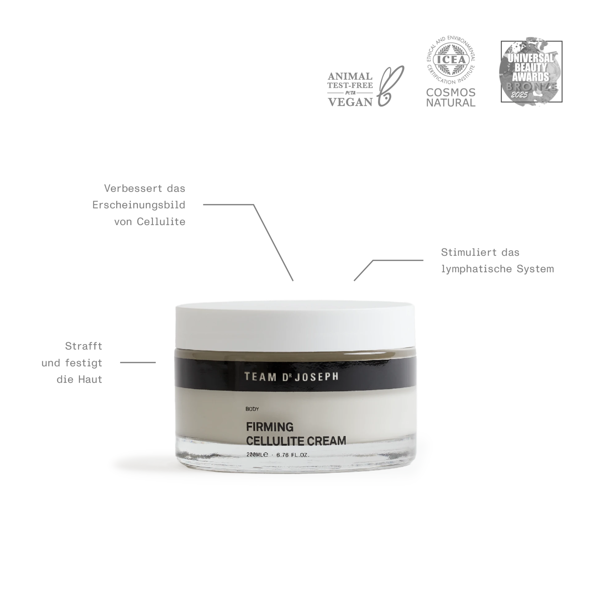 Wirkstarke Körpercreme mit Rosa Pfeffer, Kaffee- und Efeu-Extrakt für eine spürbare Verbesserung von Hautton, Textur und Festigkeit. Ideal geeignet, um dem Erscheinungsbild von Cellulite entgegenzuwirken und für ein straffes und tonisiertes Hautgefühl. Die Firming Cellulite Cream wurde bei den Universal Beauty Awards 2025 mit dem Bronze Award in der Kategorie Best Anti Cellulite Product ausgezeichnet.