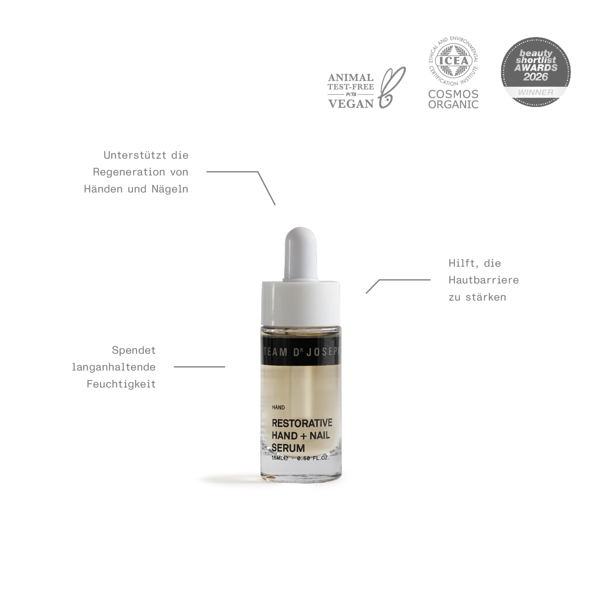 Dieses pflegende Hand- und Nagelserum mit Hyaluronsäure und Mandelproteinen verbindet intensive Feuchtigkeit mit regenerierenden Eigenschaften speziell für beanspruchte Hände und Nägel. Die Formel pflegt tiefenwirksam und unterstützt die natürliche Regeneration von Haut und Nägeln. Ideal für trockene Haut und strapazierte Nägel, sorgt das Serum für geschmeidige Hände, kräftige Nägel und ein sichtbar gepflegtes Aussehen. Das Restorative Hand + Nail Serum hat mehrere Awards gewonnen, darunter den Beauty Shortlist Award 2026 als bestes Nagel-Serum und als Best Handbag Essential – Autumn/Fall.