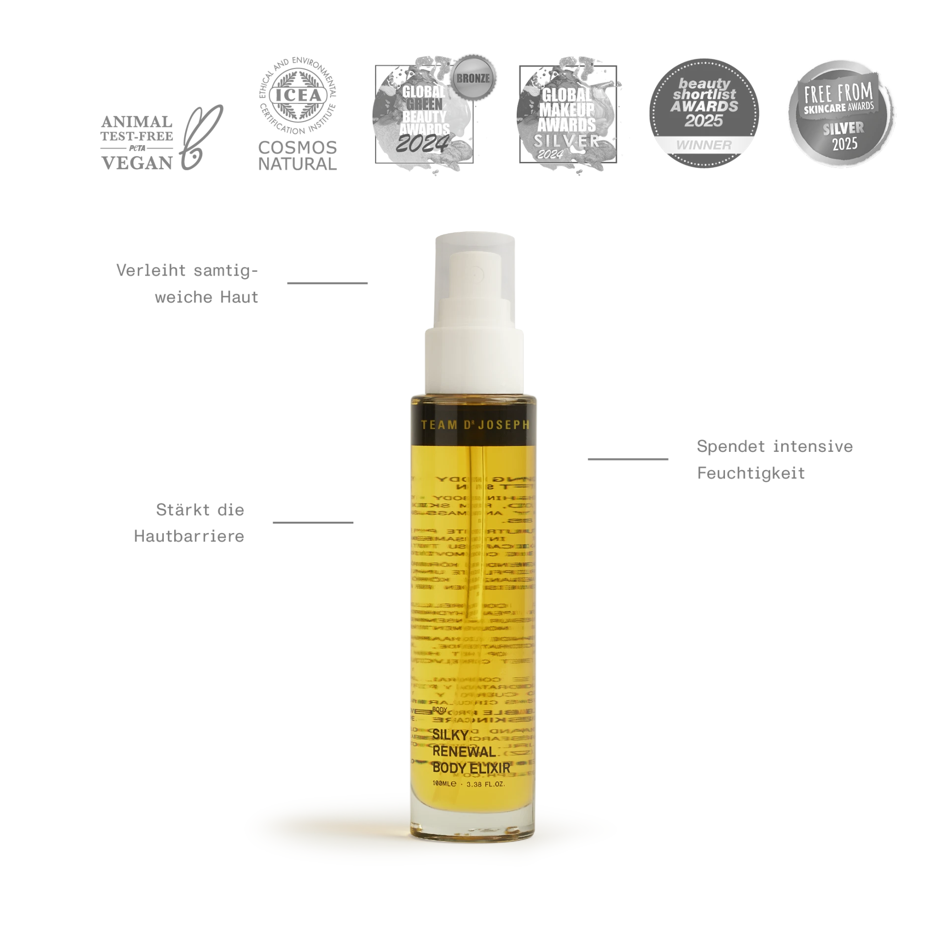 Dieses nährende Körperöl ist eine luxuriöse Mischung aus Phyto-Retinol, Phyto-Squalan und Coenzym Q10, die die Haut strafft und regeneriert. Die Kombination aus Macadamia-, Mandel- und Arganöl versorgt die Haut intensiv mit Feuchtigkeit, stärkt die Hautbarriere und sorgt für ein strahlendes Aussehen. Ein entspannender Duft aus Lavendel, Weihrauch und Rose verwöhnt die Sinne und lädt zu Ruhe und Entspannung ein. Leicht einmassiert, wird die tägliche Pflegeroutine zum Verwöhnritual, das die Haut sichtbar nährt und pflegt. Gönnen Sie sich das Gefühl samtweicher, duftender Haut – jeden Tag. Tipp: Das Öl ist auch für die Pflege von trockenem Haar geeignet. Das Körperöl wurde vom Global Green Beauty Award 2024 mit dem Bronze-Award für das Best Organic Body Product ausgezeichnet und von den Global Makeup Awards 2024 mit dem Silber-Award in der Kategorie Best Body Hydrator. Bei den Beauty Shortlist Awards 2025 gewann das Silky Renewal Body Elixir gleich in 4 Kategorien: Best Body Elixir, Best Body Serum, Best Body Product – Menopause und Best Beauty Product – Legs. Bei den Free From Skincare Awards 2025 gewann das Silky Renewal Body Elixir den Silber-Award in der Kategorie Body and Bath Oils.